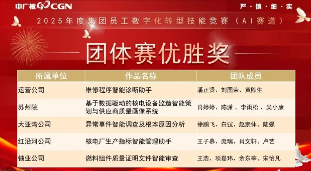 数字化转型赛道上,由计划部庞瑞、王子慕、肖文轩、信息文档部卢艺联合申报的核电厂生产指标智能管理助手作品,在中广核数字化转型技能竞赛中摘得团体优胜奖;卢艺荣获个人优胜奖。