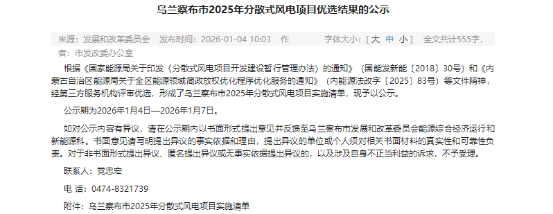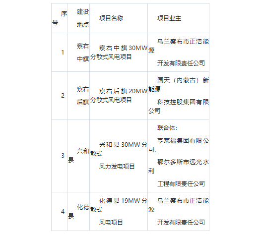 公告显示,分散式项目共4个,规模99MW。乌兰察布市正浩能源开发有限责任公司获得49MW;国天(内蒙古)新能源科技控股集团有限公司获得20MW指标;余下30MW指标由亨莱福集团有限公司、鄂尔多斯市远光水利工程有限责任公司组成的联合体获得。