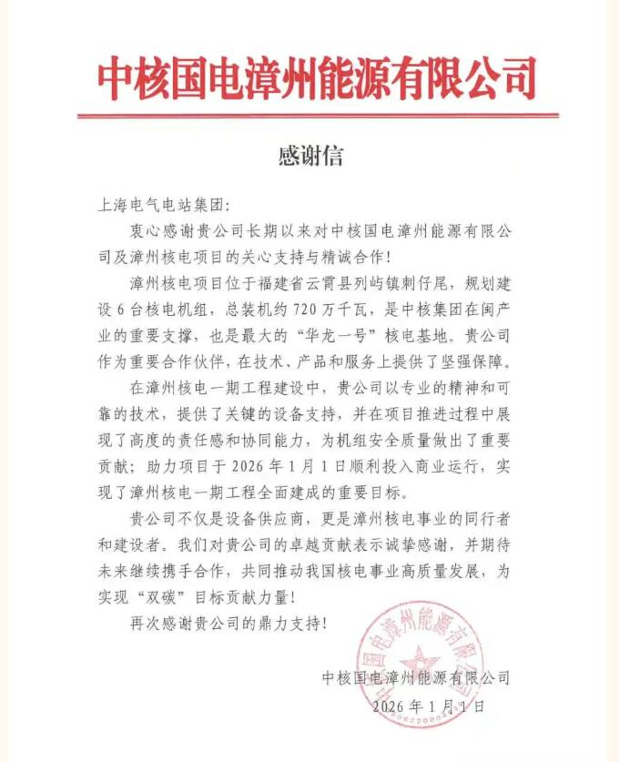 漳州2号机组投运当天,业主中核国电漳州能源有限公司为主要设备供货商、重要合作伙伴电站集团发来感谢信,感谢电站集团长期以来提供的专业技术、可靠设备及有力支持,为机组安全质量提升作出了重要贡献,为漳州核电一期工程全面建成奠定了坚实基础。