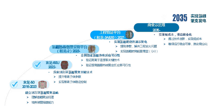 第三阶段,目标是在2035年进入聚变示范堆阶段,解决低成本和商业化的问题,让聚变能源发的第一度电在中国实现。