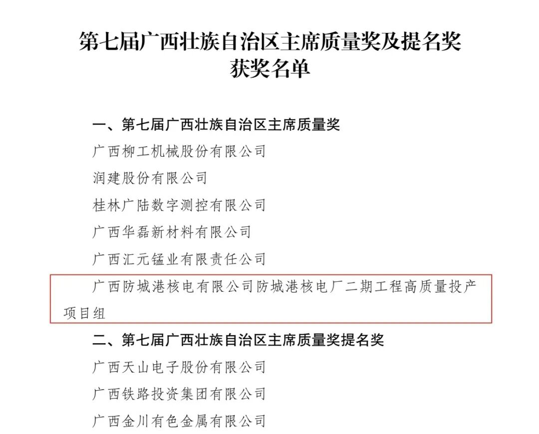 近日,广西壮族自治区人民政府公布第七届自治区主席质量奖及提名奖获奖名单,中广核防城港核电二期工程高质量投产项目组荣获第七届广西壮族自治区主席质量奖。这是防城港核电自2018年获得第四届自治区主席质量奖后,第二次获此殊荣。