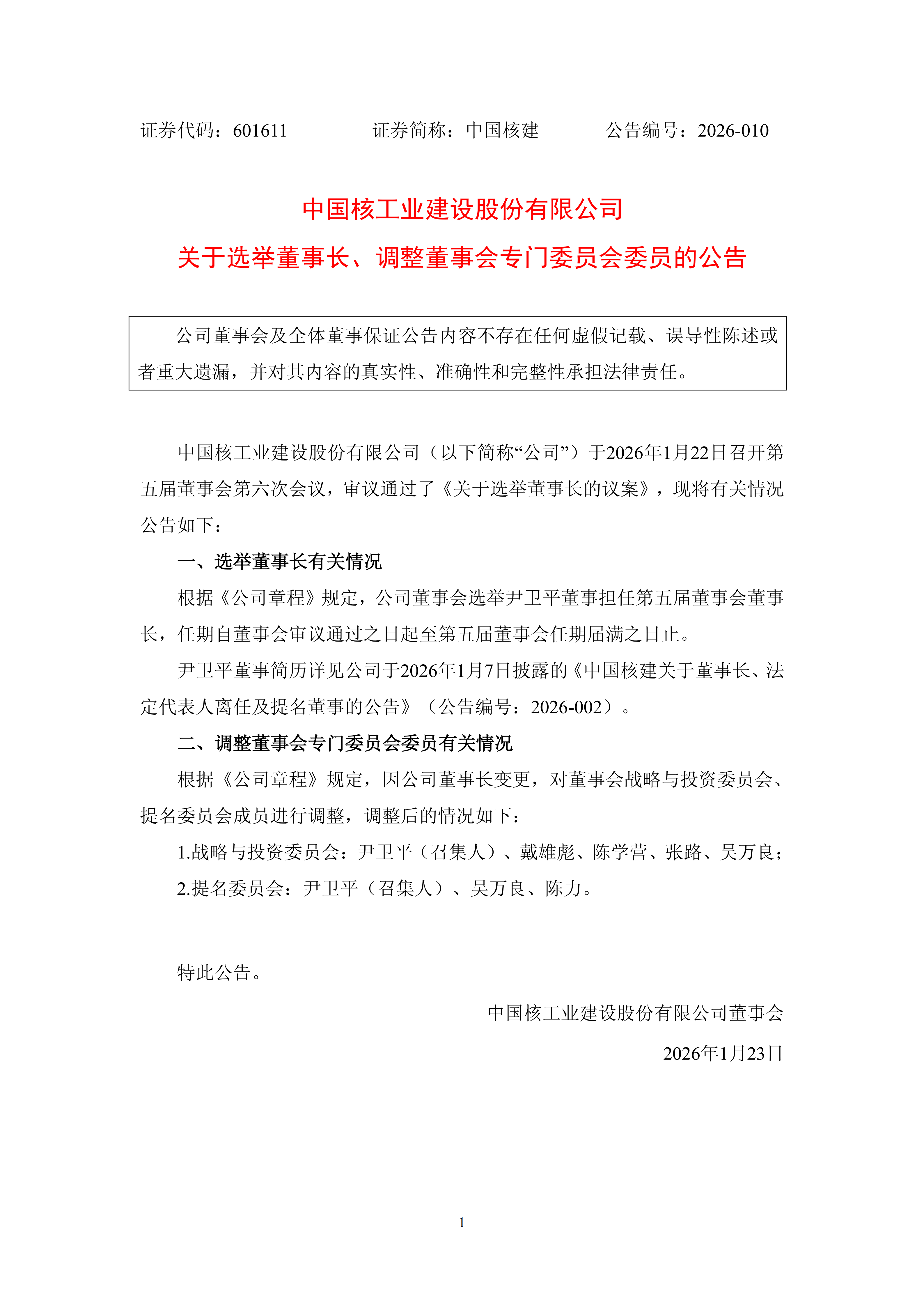 1月22日,中国核工业建设股份有限公司(以下简称公司)公告称,公司于2026年1月22日以现场方式召开第五届董事会第六次会议,审议通过了《关于选举董事长的议案》。