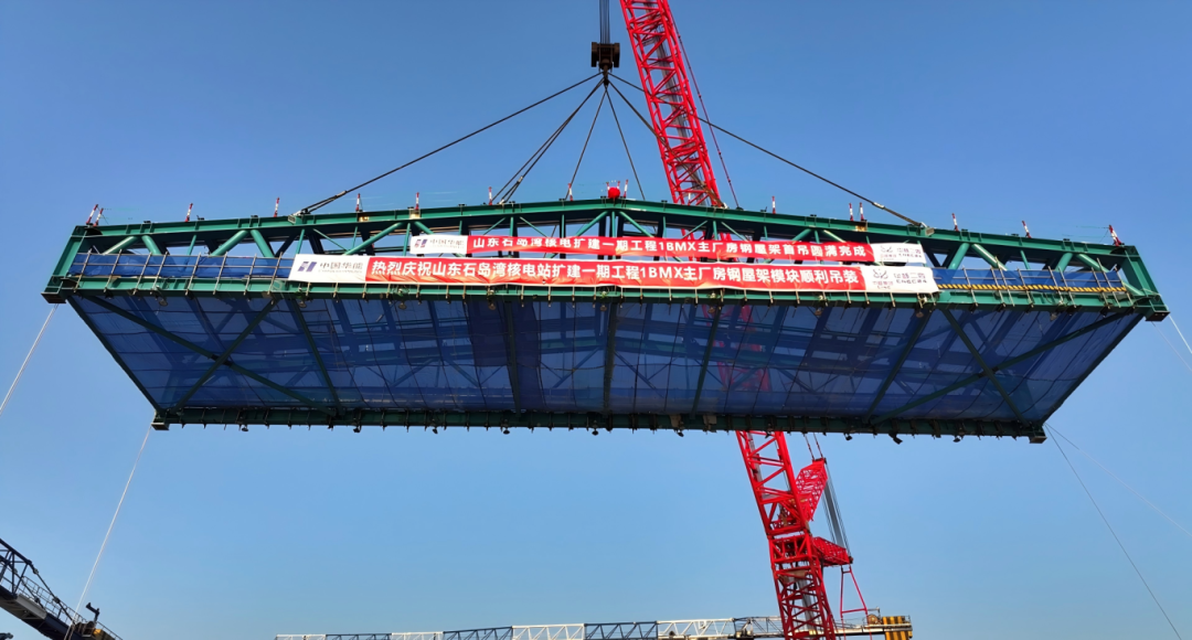 此次吊装的钢屋架采用钢结构与钢筋混凝土结合的形式,呈对称双坡结构,是确保厂房整体结构稳定的重要构件。该模块为第二榀钢屋架模块,自重约202.2吨。在公司党委及核电事业部的统筹部署下,石岛湾核电项目团队秉持精益求精的精神,充分汲取既往项目实战经验,系统开展施工组织与技术创新,确保此次吊装任务安全、高效完成。