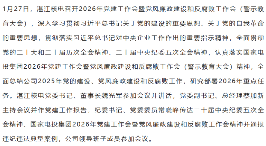 湛江核电:魏光军接任党委书记、董事长,蔡加新接任党委副书记、总经理
