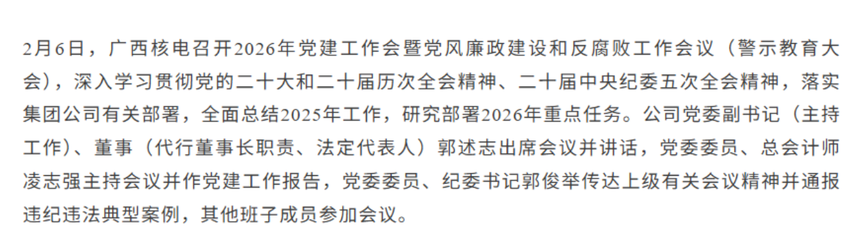 广西核电:董事长、党委书记由郭述志接任(党委副书记(主持工作)、董事(代行董事长职责、法定代表人)