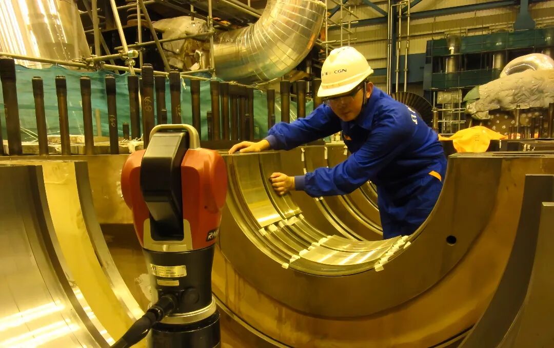 传统汽轮机通流间隙测量的压铅丝工艺,需反复吊装180吨转子和百余吨汽缸,强度大、风险高、耗时长,由中广核运营自主研发的激光测通流技术,采用汽缸转子分离测量法,通过激光定位精准获取坐标,无需吊装转子,即可高精度(0.02毫米)计算内部间隙,检修工期从半个月缩短至4天,作业风险大幅降低。