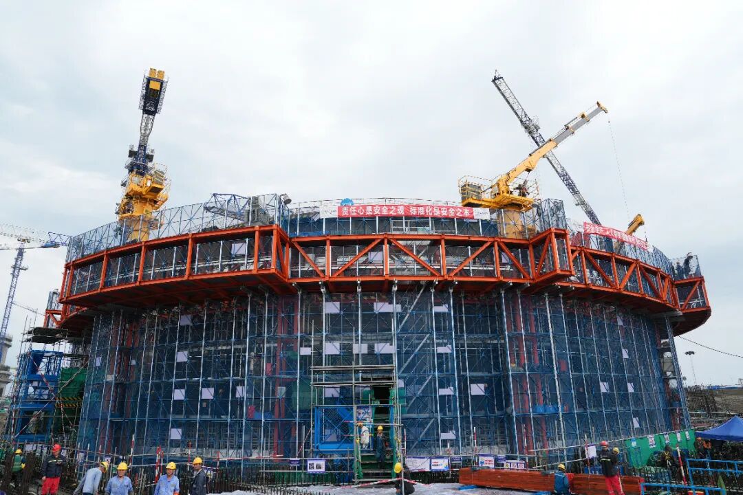 核岛反应堆厂房施工集成平台被誉为核电版造楼机,其应用大大提高了反应堆厂房的施工效率,通过智能化、集成化的设计理念为反应堆厂房的施工安全和质量保驾护航。2024年5月29日,作为我国核电行业首次应用的集成化施工平台,这座核电版造楼机在陆丰核电项目6号机组完成首次顶升。核岛反应堆厂房施工集成平台由钢平台系统、支承系统、动力系统等组成,根据施工进展,可为反应堆厂房多种施工状态提供安全可靠的作业平台,优化复杂的施工措施;通过提供内外壳立面多层作业空间,形成高效的施工流水,优化核岛工程总体施工逻辑和节奏;通过吊装设备集成及模板挂设整体提升,大幅减少反应堆厂房施工对周边塔吊的依赖,有效提升反应堆厂房及周边厂房施工效率。