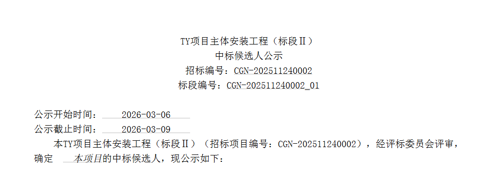 本TY项目主体安装工程(标段II)(招标项目编号:CGN-202511240002),经评标委员会评审,确定本项目的中标候选人,现公示如下: