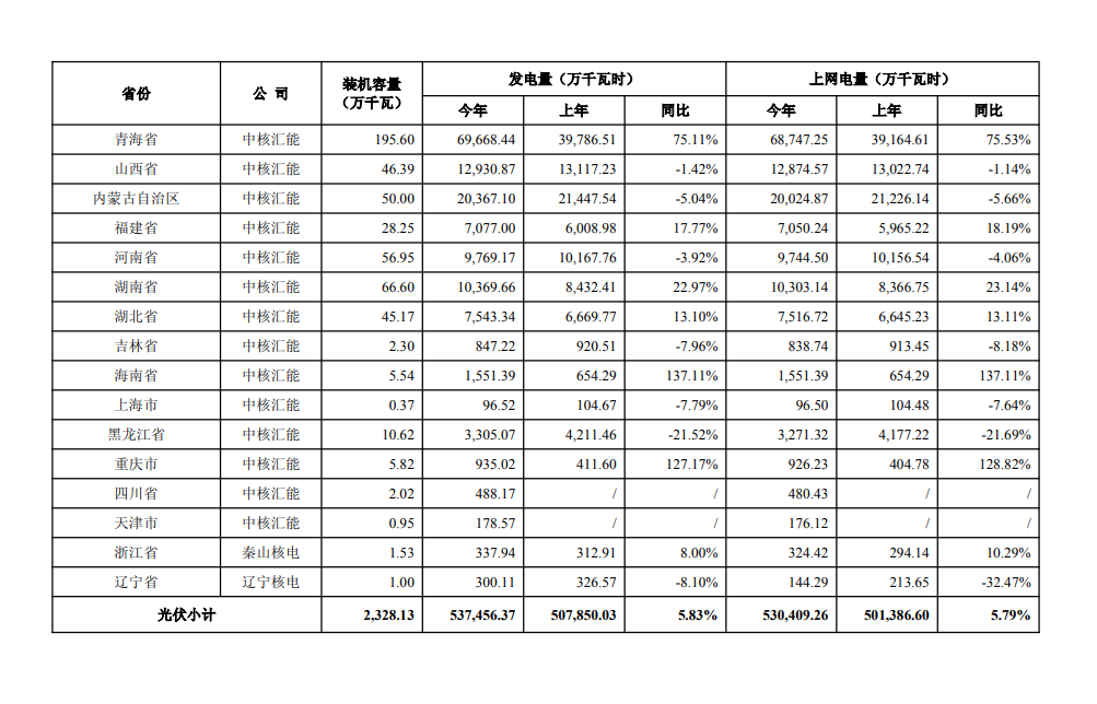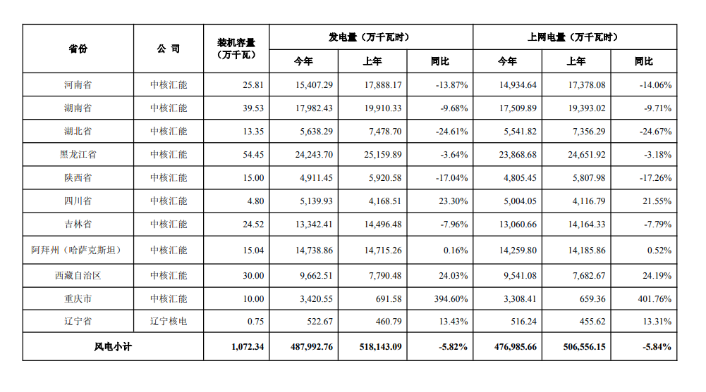 海南核电发电量同比下降 10.61%,主要原因为:机组检修天数较去年同期有所增加,发电量同比减少。