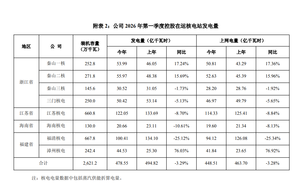 2026年一季度,公司核电机组发电量累计为478.55亿千瓦时1,同比下降3.29%;上网电量累计为448.51亿千瓦时,同比下降3.28%。发电量和上网电量同比下降的主要原因为核电机组期间开展检修的天数多于去年同期。