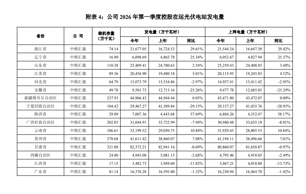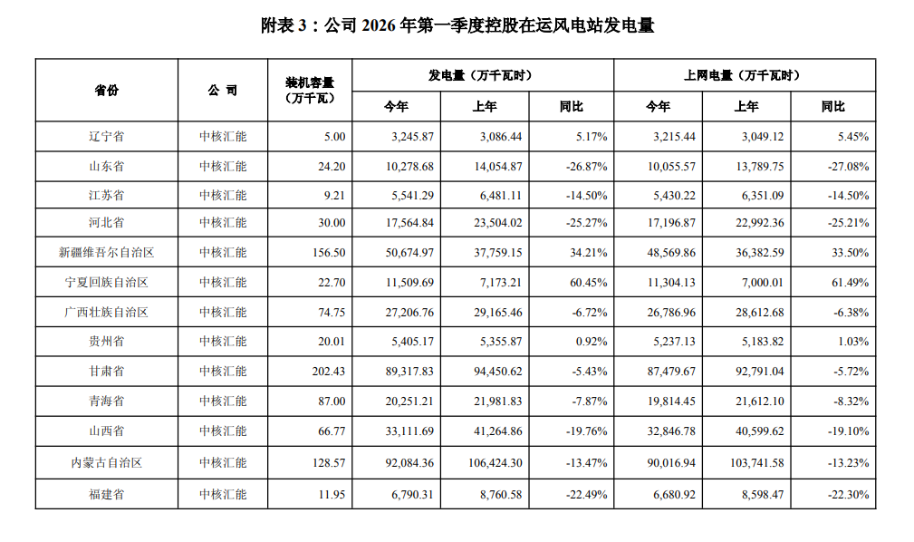 截至2026年3月31日,公司2026年一季度累计商运发电量为581.09亿千瓦时,同比下降2.73%;上网电量为549.25亿千瓦时,同比下降2.70%。