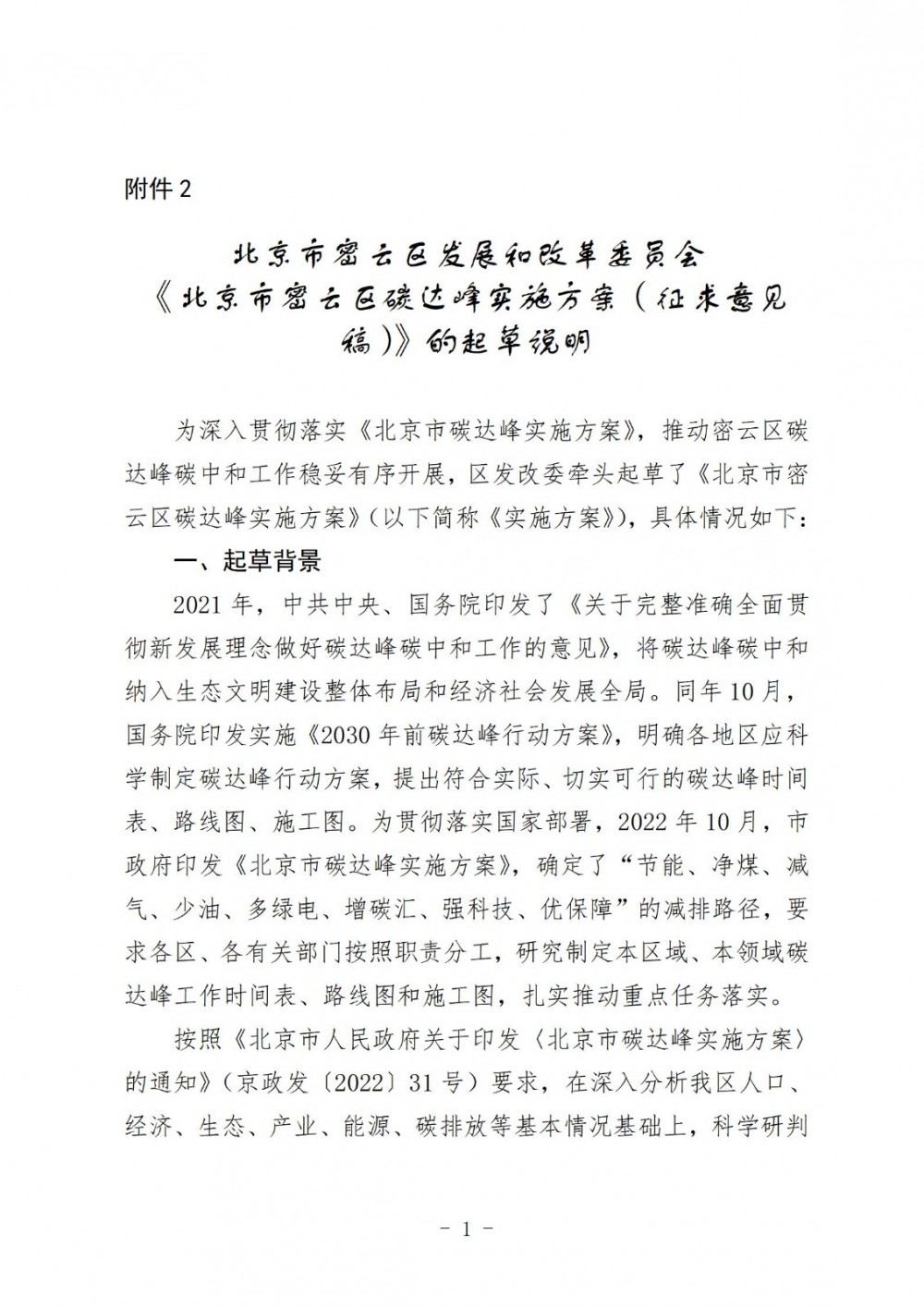 附件2:《北京市密云区碳达峰实施方案(征求意见稿)》的起草说明