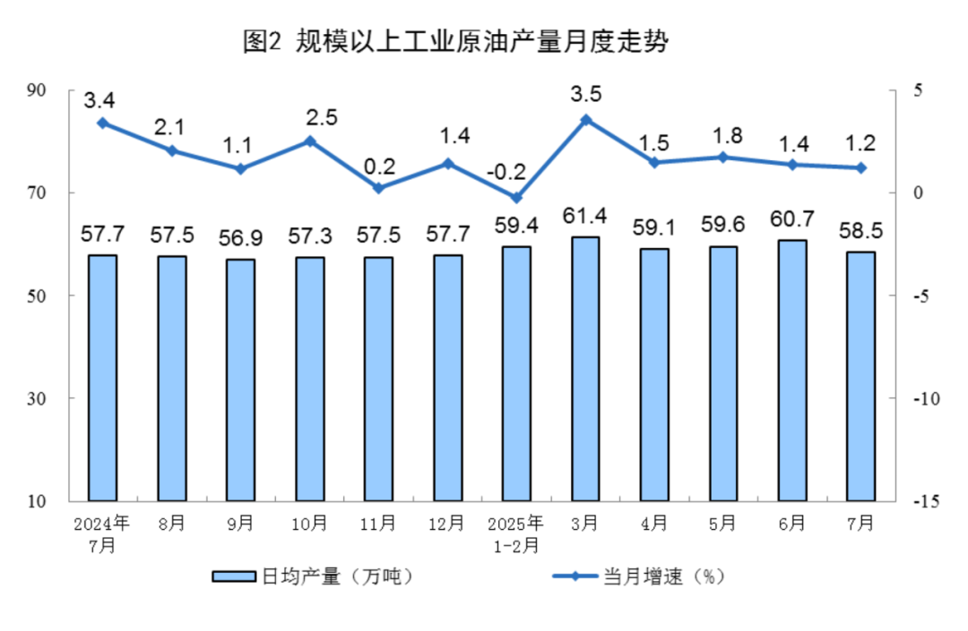 原油生产稳定增长。7月份,规上工业原油产量1812万吨,同比增长1.2%,增速比6月份放缓0.2个百分点;日均产量58.5万吨。