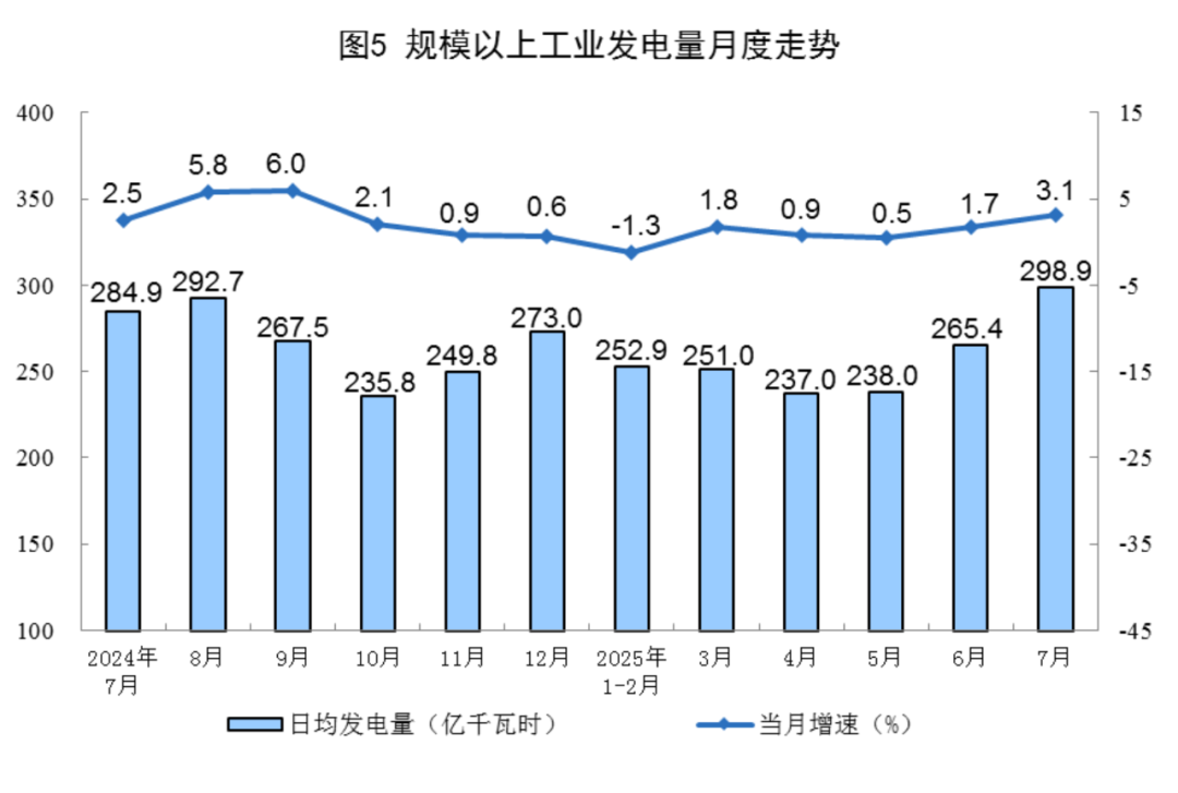 规上工业电力生产增长加快。7月份,规上工业发电量9267亿千瓦时,同比增长3.1%,增速比6月份加快1.4个百分点;日均发电298.9亿千瓦时。1~7月份,规上工业发电量54703亿千瓦时,同比增长1.3%,扣除天数原因,日均发电量同比增长1.8%。