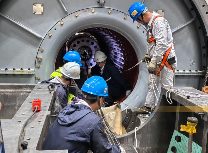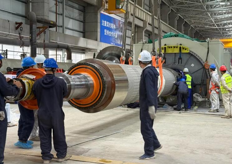 本次以牵引式进行穿发电机转子,随着指挥人员的指令,专用行车缓缓起吊转子,沿着预先铺设的滑道平稳推进,在安装团队的密切配合下,转子如同“穿针引线”般精准落入定子膛内,与发电机各部件完美对接。