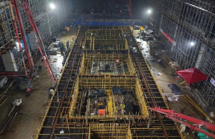 该汽轮机基座位于二号主厂房17米运转层,结构复杂、精度要求高,累计浇筑混凝土1939立方米,历时14小时连续作业。