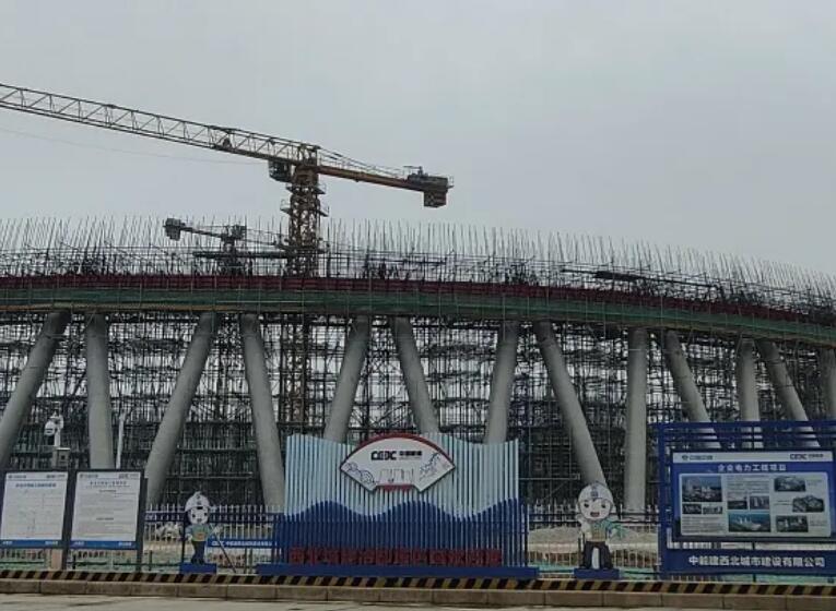 西北城建主要承建该项目C标段1座烟囱、两座冷却塔、1个循环水泵房的施工。两座自然通风冷却塔塔筒为双曲线型现浇钢筋混凝土薄壳结构,塔高175米,共111节,设48对人字柱。
