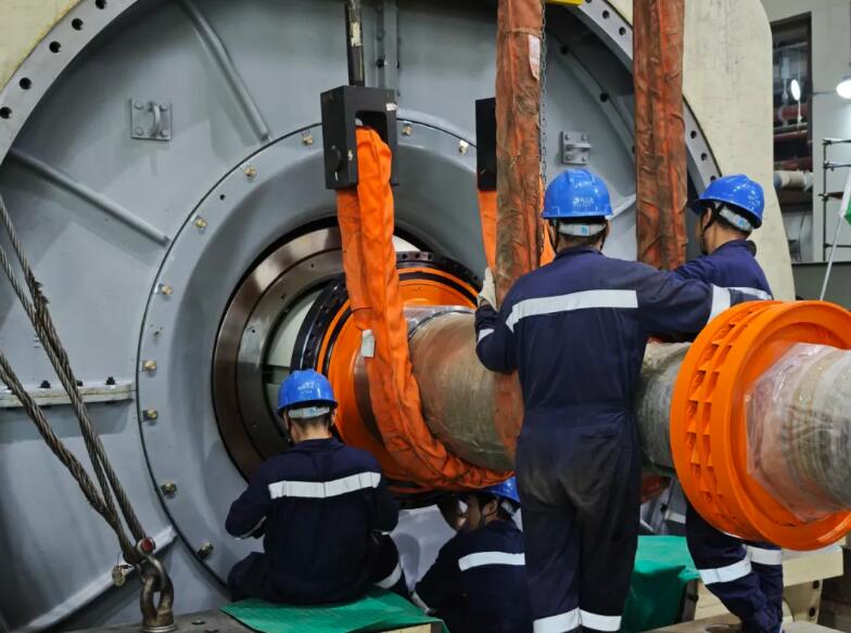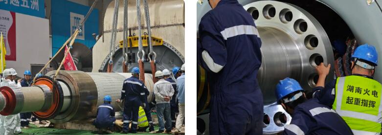经3个多小时连续奋战,项目团队攻克了一场融合“重负荷、高精准、高协同”的施工硬仗,最终实现转子平稳穿装一次性成功。