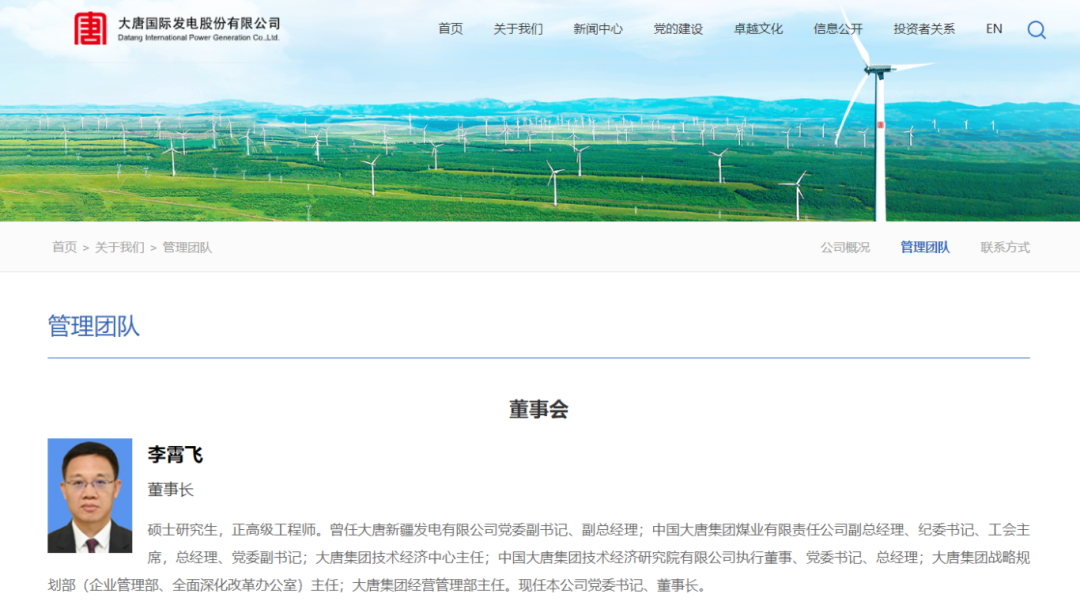 李霄飞,硕士研究生,正高级工程师。曾任大唐新疆发电有限公司党委副书记、副总经理;中国大唐集团煤业有限责任公司副总经理、纪委书记、工会主席,总经理、党委副书记;大唐集团技术经济中心主任;中国大唐集团技术经济研究院有限公司执行董事、党委书记、总经理;大唐集团战略规划部(企业管理部、全面深化改革办公室)主任;大唐集团经营管理部主任。现任大唐国际党委书记、董事长。