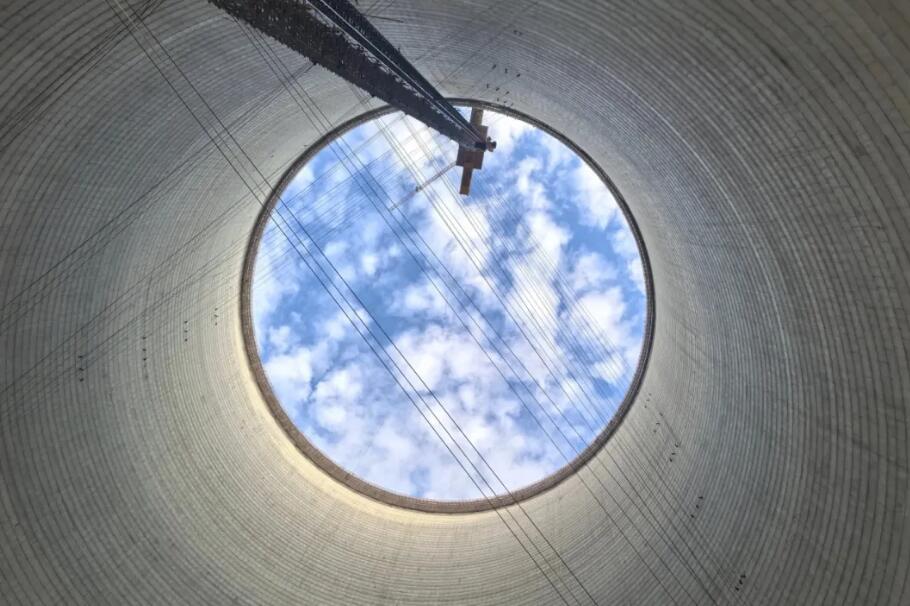 该项目间接塔塔高205米,采用对称双曲线钢筋混凝土薄壳结构,由44对钢管混凝土X形支柱承托。筒壁共分115节,通过附着式三角架翻模工艺施工,最终呈现出曲线流畅、表面光洁、色泽均匀的“内实外光”高品质效果,擎天而立,一气呵成。