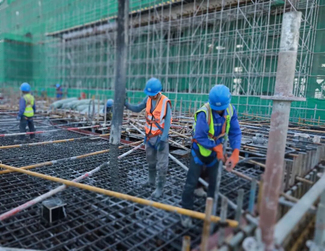 为确保顺利浇筑,项目部多次组织专题会议探讨解决相关技术难题,优化混凝土专项雨季施工方案。施工过程中,项目部每天组织日协调会进行统筹安排,对钢筋绑扎、模板加固、埋件安装以及现场安全设施进行逐项检查,对关键的设备埋件精度进行严格把控,确保符合设计要求。正式浇筑前,项目部协同业主、监理、总包进行了周密的联合验收,对实体质量进行严格把关。