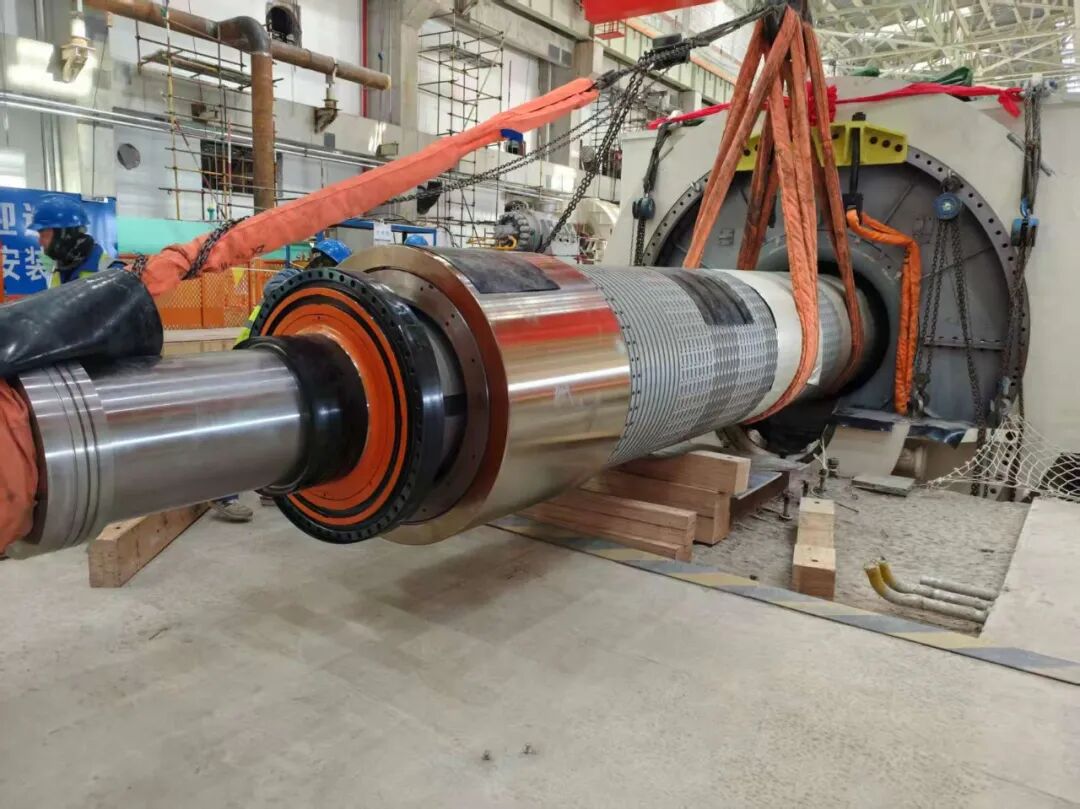 面对转子与定子间隙狭小、作业空间受限的双重挑战,项目团队提前谋划、科学部署,技术人员采用滑道式穿装法,施工前对定子、转子进行无尘清理与全面检查,通过拉钢丝法反复校准中心线,确保受力点与移动轨迹精准无误。作业中,各岗位人员分工明确、配合默契,起重指挥口令清晰,安装人员实时监测定转子间隙,经过“毫米级”精细微调,转子精准落于预设轴瓦之上。复测数据显示,转子与定子气隙分布均匀,各项指标均优于设计标准,圆满达成“零误差、零损伤”目标。