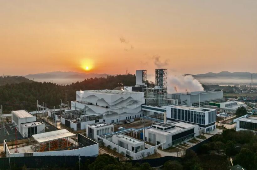 项目以天然气为主要能源,具有灵活高效、响应速度快、变负荷能力强等优势。机组热态启动至满负荷仅需90分钟,其联合循环效率最高可达到64.15%,较常规百万千瓦燃煤机组提升约17%,碳排放强度约为百万千瓦燃煤机组的40%,用水量仅为燃煤电厂的1/3。项目总体布局和建筑物设计与“两山”理念紧密结合,建筑与环境融合共生,致力打造“两山明珠、绿色典范”的智慧电厂。