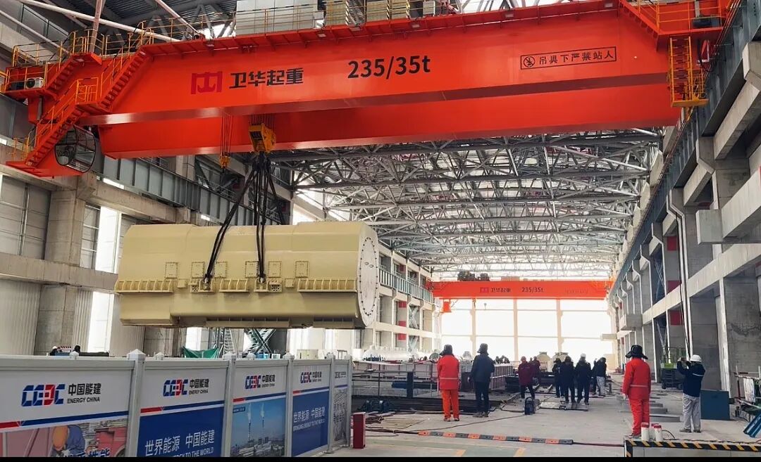 为攻克这一施工难题,山西院总承包项目部组建专项技术攻关小组,结合设备特性与现场施工条件,反复论证优化安装方案,细化吊装流程。安装期间,现场协调起重、机械、安全等多专业团队协同作业,全程监控设备起吊、转运、就位的每一个步骤,最终实现内定子精准就位,安装精度完全满足设计规范要求。