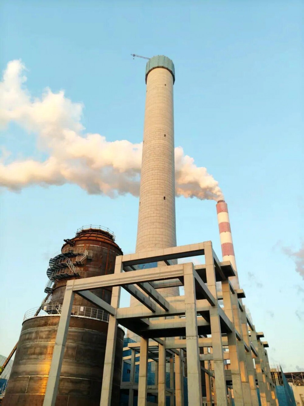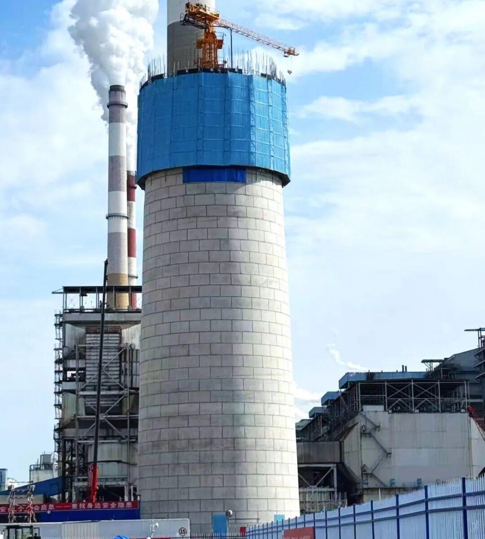 西柏坡电厂四期工程位于石家庄市平山县西柏坡经济开发区,是河北省重点能源项目。项目的建设将替代区域约287台燃煤和燃气炉,减少标煤消耗约180万吨,同步形成“热电联供+余热利用+固废处置”的循环经济产业链。待建成后预计每年可新增发电量约59.4亿千瓦时、供热量约1766.4万吉焦,集中供热面积约3200万平方米,工业蒸汽供应能力达200吨/时,将为京津冀协同发展提供坚实的清洁电力支撑与能源保障,助力区域经济的可持续发展,为我国能源革命的推进贡献重要力量,共同谱写清洁能源建设新篇章。作为西柏坡电厂的“视觉焦点”,本次建设的烟囱整体高度为210米,其筒壁高度为202米,整体高度相当于一座70层的摩天大楼。为了让这座烟囱安全、高效地“长高”,项目部在施工中创新采用国内首次应用的——附着式脚手架+翻模施工工艺,并配套了施工升降机+液压顶升平桥组合体系负责垂直运输,混凝土地泵搭配布料机协同完成混凝土输送,有效地将高空作业面转变为安全的“空中移动工厂”。