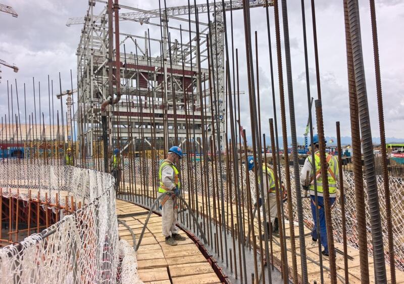 该筒壁为混凝土结构,烟囱外筒顶标高为212米,筒壁第一节底部外半径为13.2米,壁厚为0.7米,此次浇筑采用C40P8混凝土,历时4小时,浇筑方量77立方米。