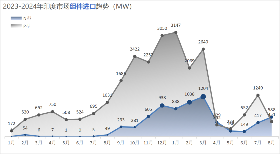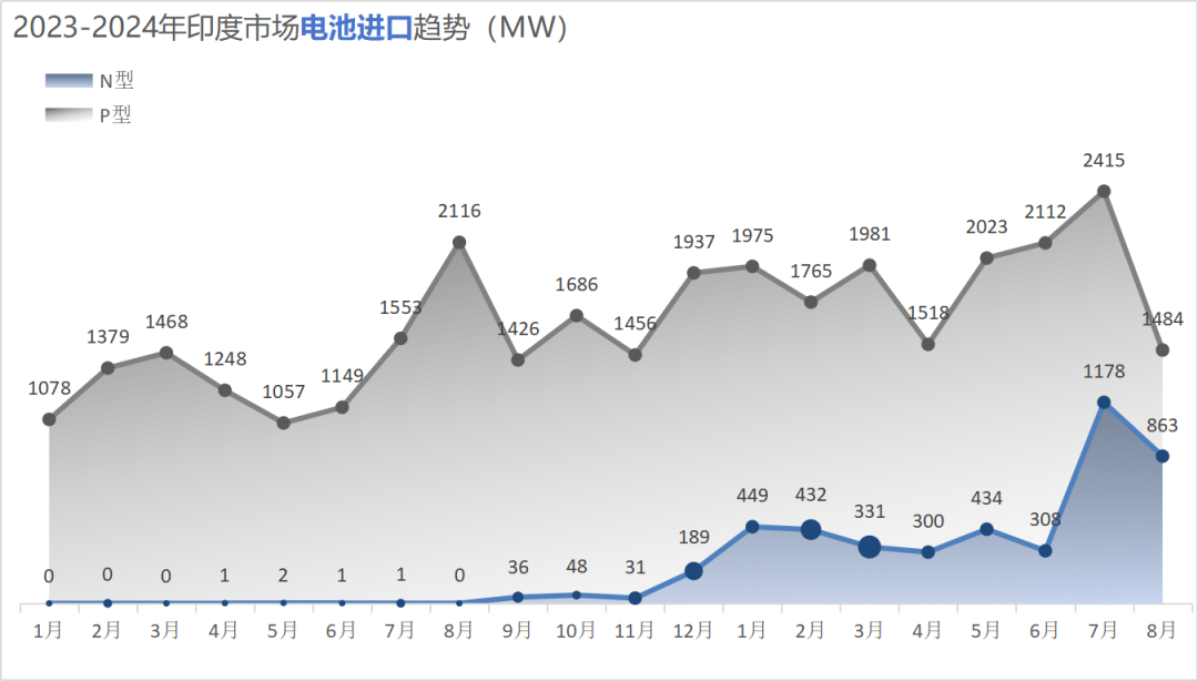 再往上游环节看,印度市场在2024年1-8月进口光伏电池片总量约19.5GW,其中N型占比提升至22.1%,而在2023年8月之前,这一数字还仅仅只是0.08%。