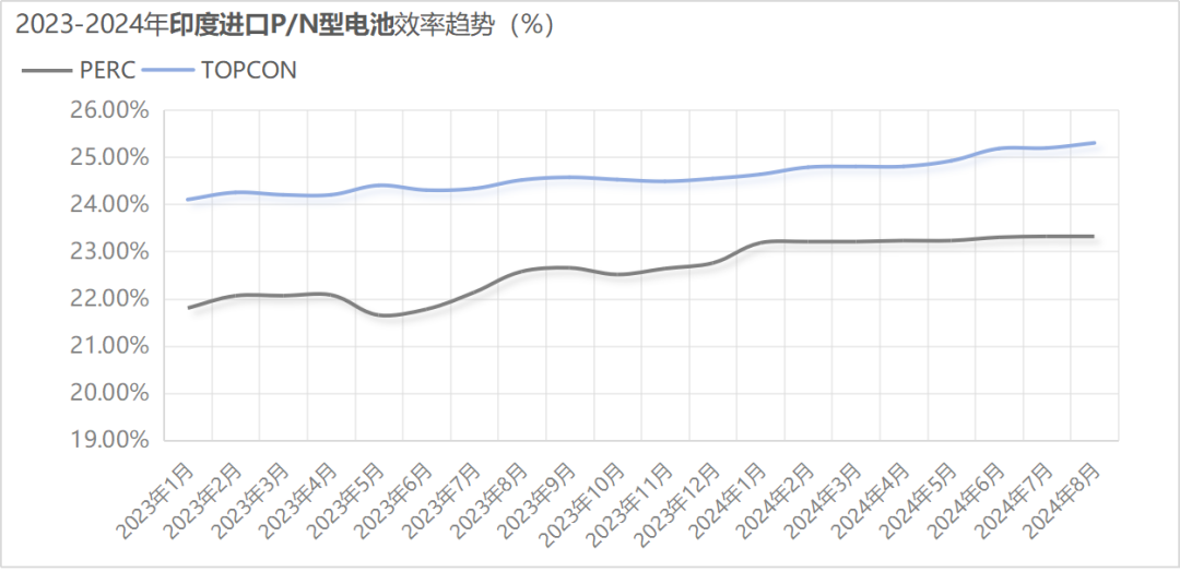 关于效率方面,在印度进口的光伏电池片中,P型电池片效率已经达到了平台期,整体平均效率维持在23.3%水平,而与此同时,进口N型电池片效率则不断提升至25.2%甚至更高的平均效率水准。