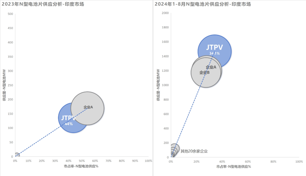 2023年,印度市场对N型电池的需求开始增长,尽管当时N型电池供应企业仅有5余家,但捷泰科技凭借其在N型电池领域的深耕和技术创新,成功在市占率上排名第二。