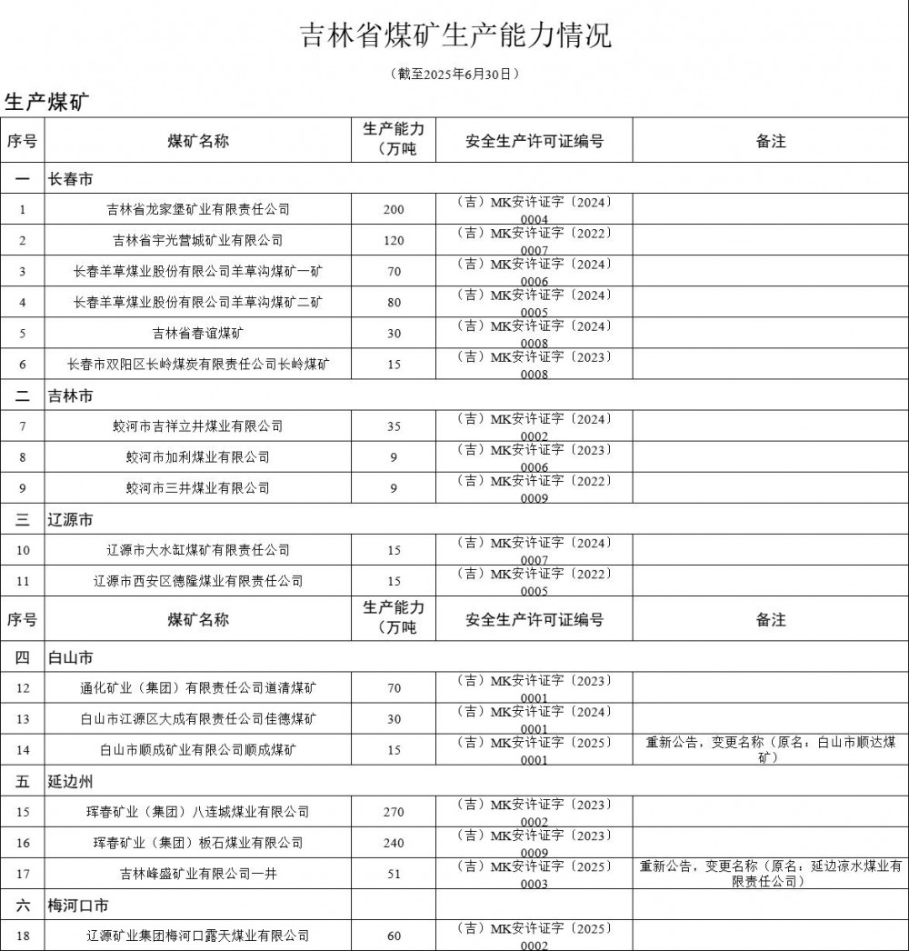 吉林省能源局关于2025年上半年煤矿产能情况的通告