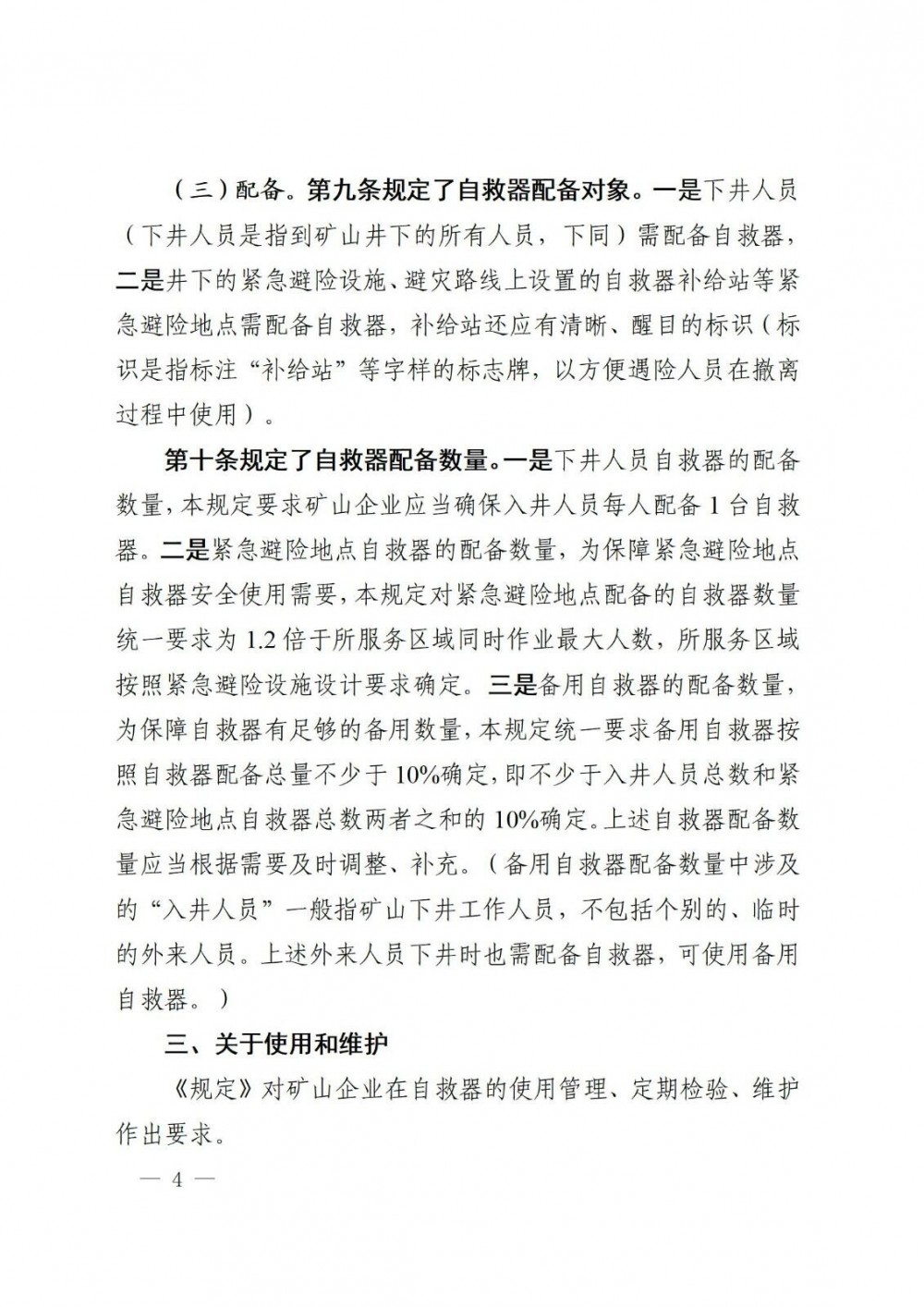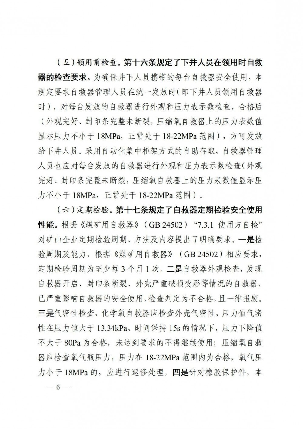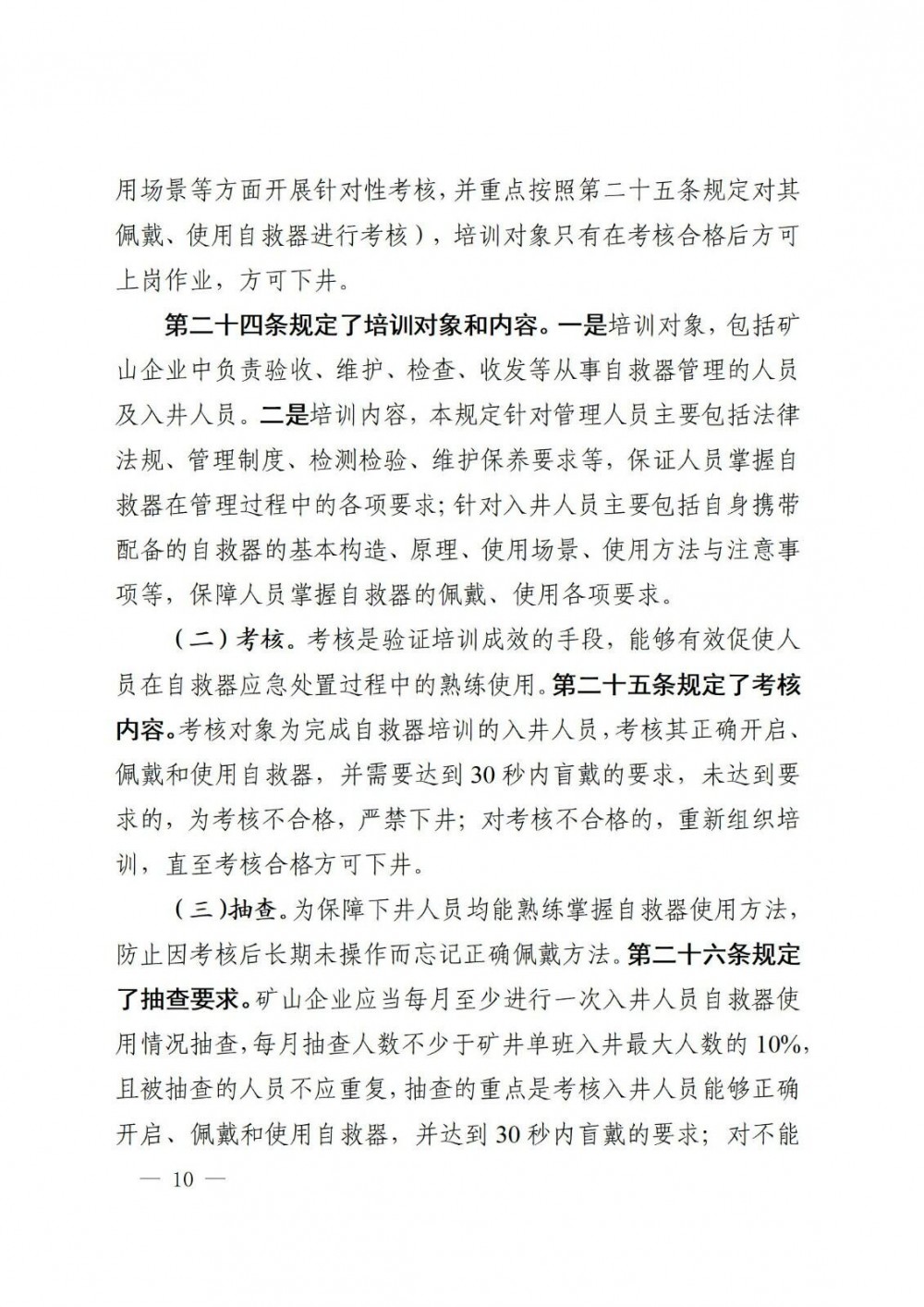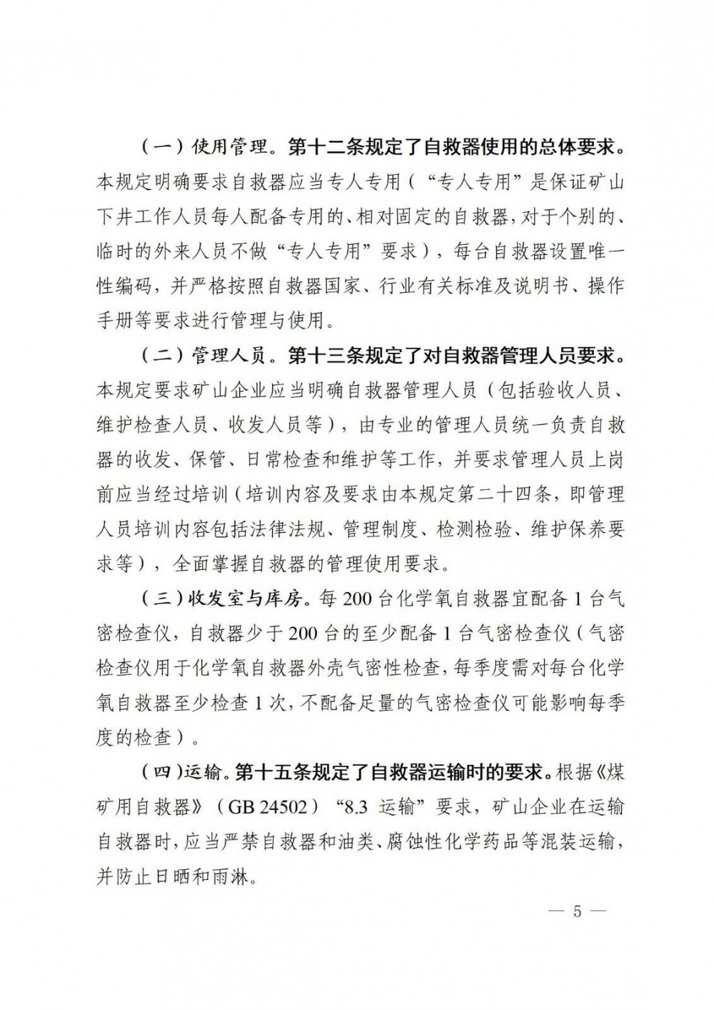为指导各级矿山安全监管监察部门和矿山企业全面准确理解《矿用自救器安全管理规定(试行)》(矿安〔2025〕2号)的相关规定,进一步加强矿用自救器的选用、配备、使用、维护、报废及培训等工作,国家矿山安全监察局组织编制了《〈矿用自救器安全管理规定(试行)〉解读》。现予以公布,供各级矿山安全监管监察部门和矿山企业使用。