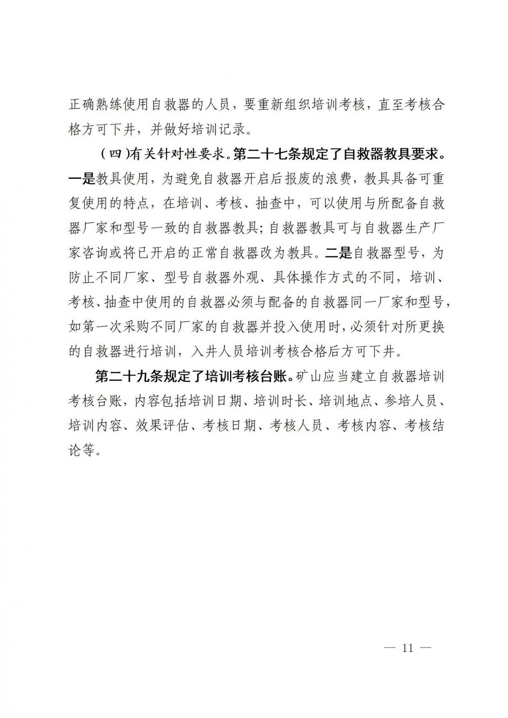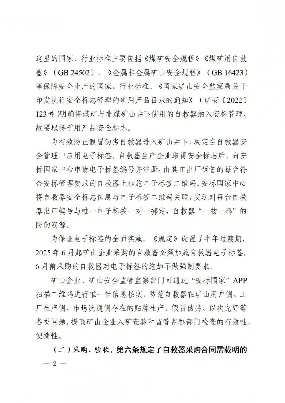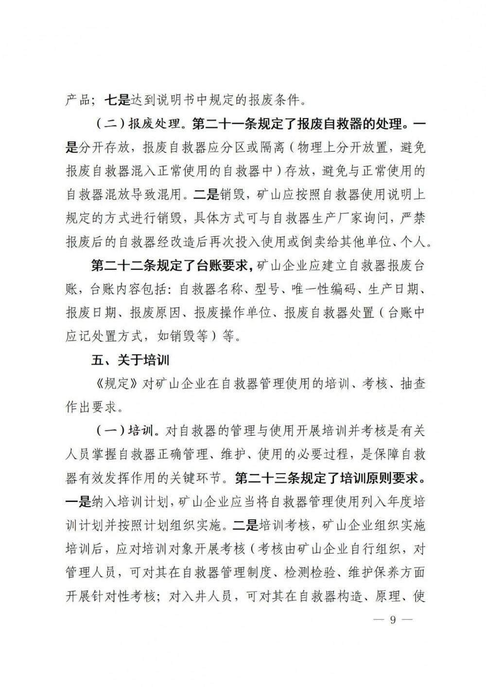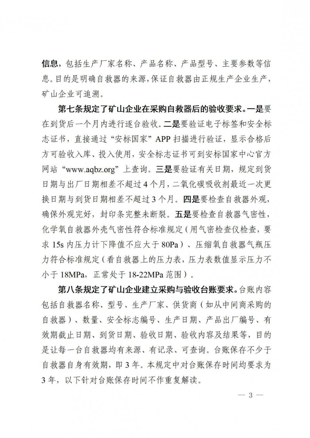 为指导各级矿山安全监管监察部门和矿山企业全面准确理解《矿用自救器安全管理规定(试行)》(矿安〔2025〕2号)的相关规定,进一步加强矿用自救器的选用、配备、使用、维护、报废及培训等工作,国家矿山安全监察局组织编制了《〈矿用自救器安全管理规定(试行)〉解读》。现予以公布,供各级矿山安全监管监察部门和矿山企业使用。