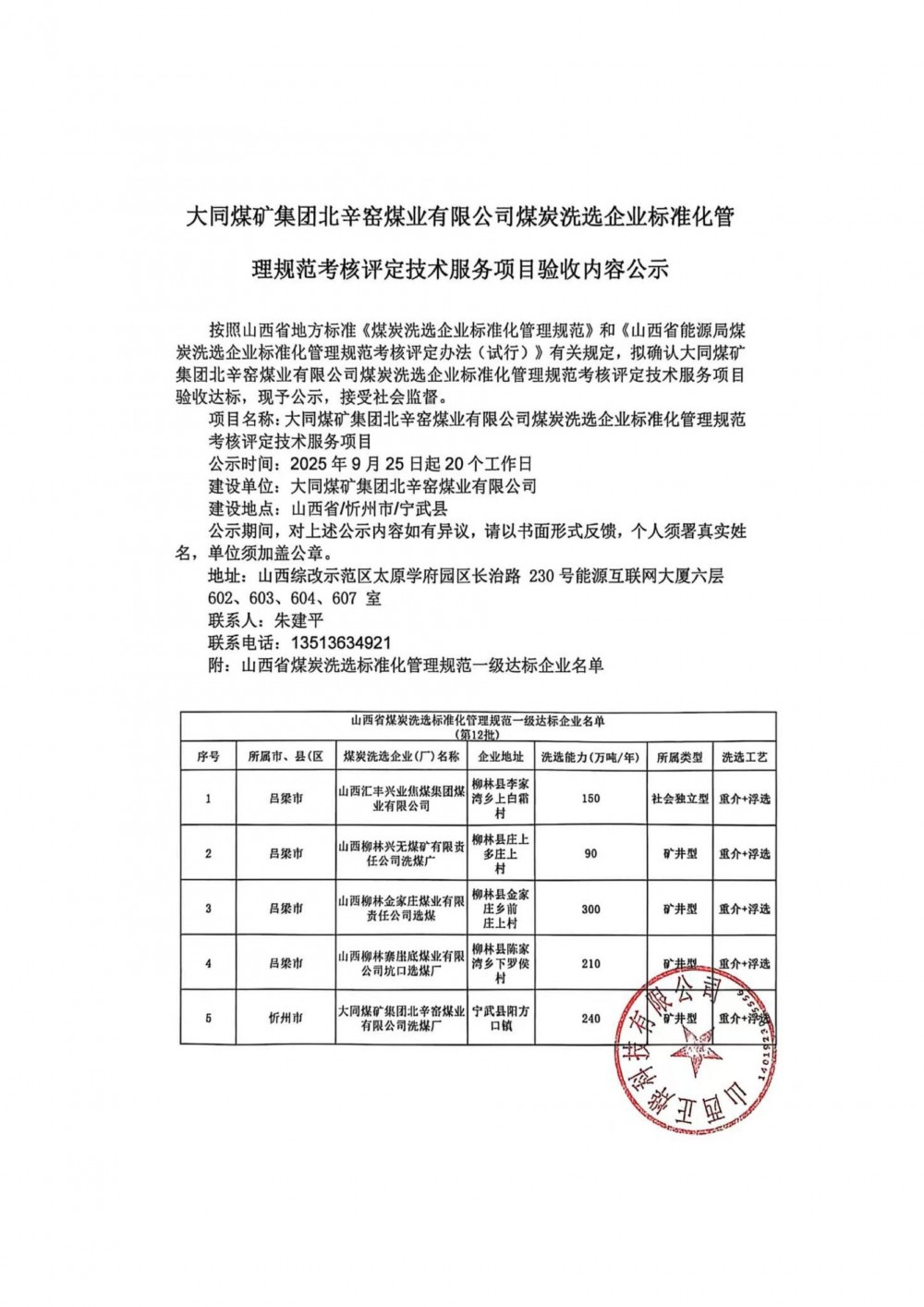 大同煤矿集团北辛窑煤业有限公司煤炭洗选企业标准化管理规范考核评定技术服务项目验收内容公示