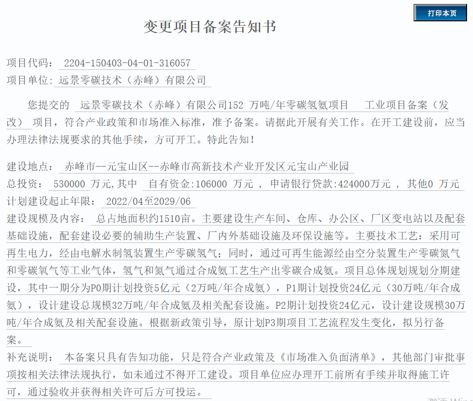 11月29日,内蒙古赤峰市元宝山区发展和改革委员会就远景零碳技术(赤峰)有限公司152 万吨/年零碳氢氨项目发布《变更项目备案告知书》。