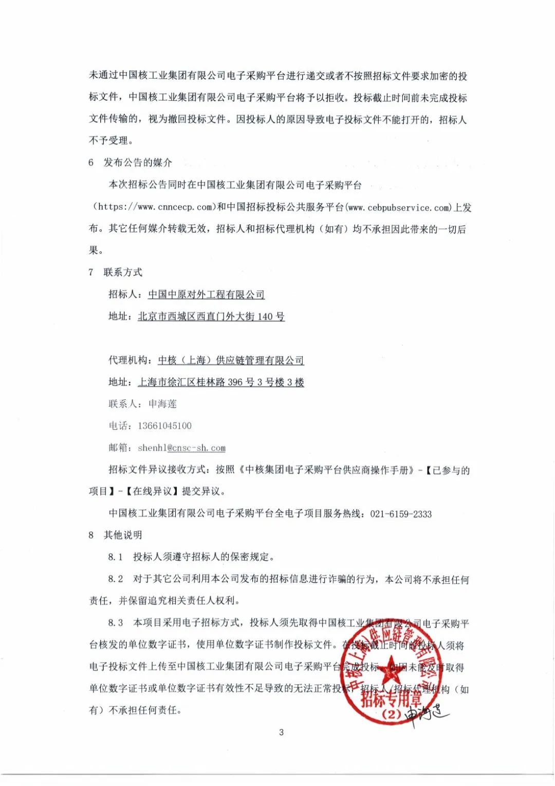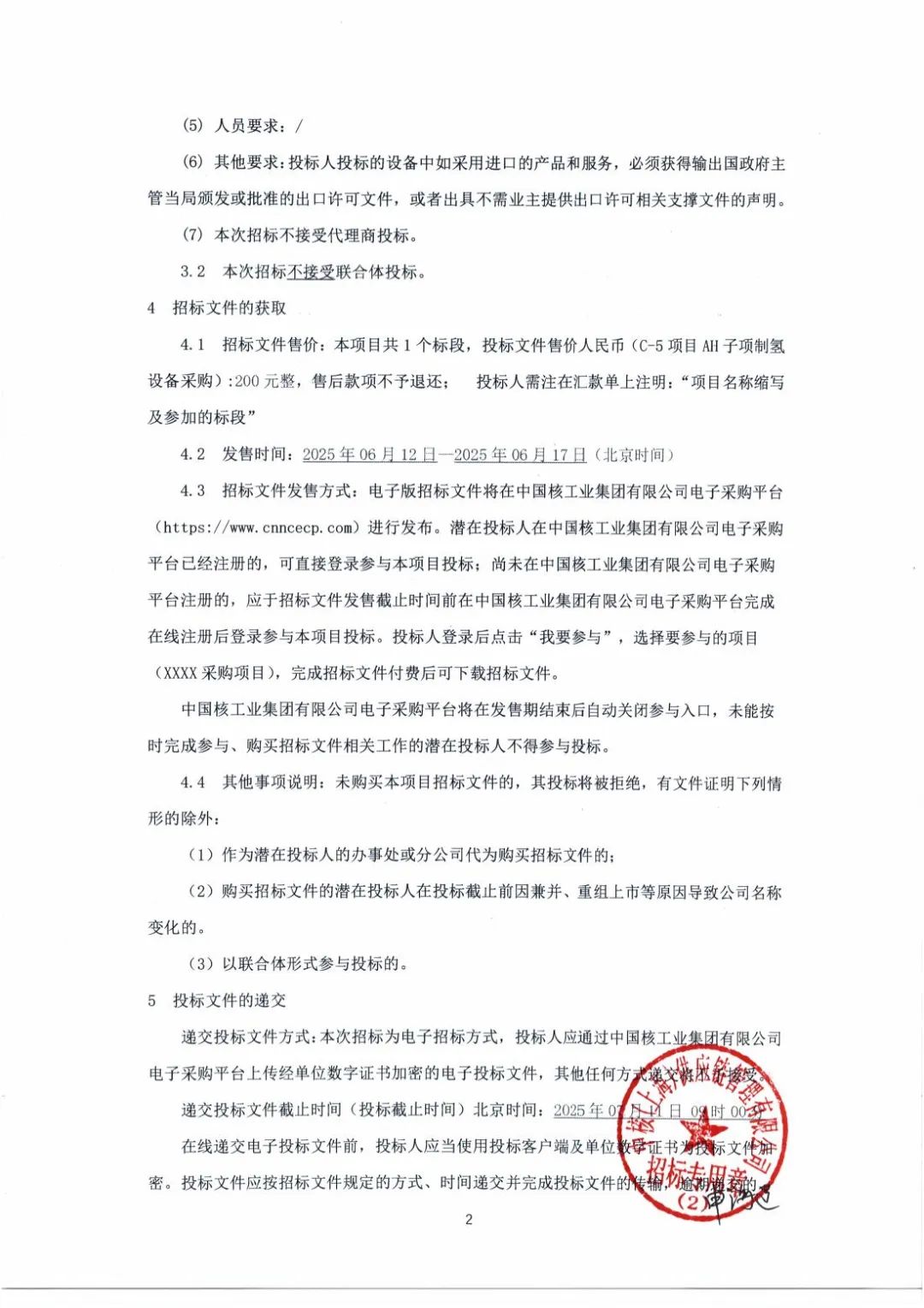 根据招标公告,项目为巴基斯坦恰希玛C-5核电项目。招标范围包括C5项目AH子项制氢设备为系统包设备及相关服务,主要包括二套制氢(干燥、纯化)装置、两台中压氢气贮罐、一套氢气分配装置及其配套设备。