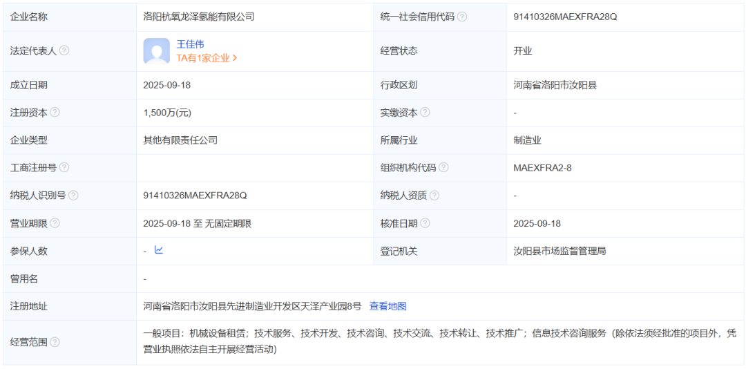 洛阳杭氧龙泽氢能有限公司成立于2025年09月18日,注册资本1500万元,注册地位于河南省洛阳市汝阳县先进制造业开发区天泽产业园8号,法定代表人为王佳伟。经营范围包括一般项目:机械设备租赁;技术服务、技术开发、技术咨询、技术交流、技术转让、技术推广;信息技术咨询服务。
