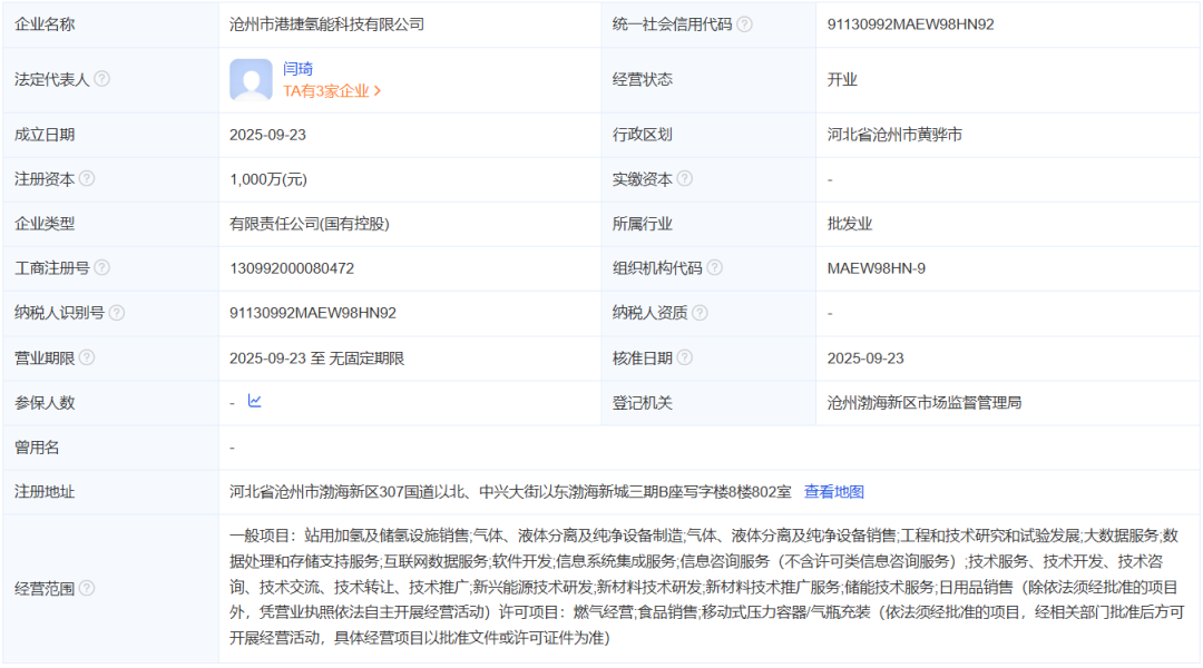 沧州市港捷氢能科技有限公司成立于2025年09月23日,注册资本1000万元,注册地位于河北省沧州市渤海新区307国道以北、中兴大街以东渤海新城三期B座写字楼8楼802室,法定代表人为闫琦。经营范围包括一般项目:站用加氢及储氢设施销售;气体、液体分离及纯净设备制造;气体、液体分离及纯净设备销售;工程和技术研究和试验发展;大数据服务;新兴能源技术研发;新材料技术研发等。