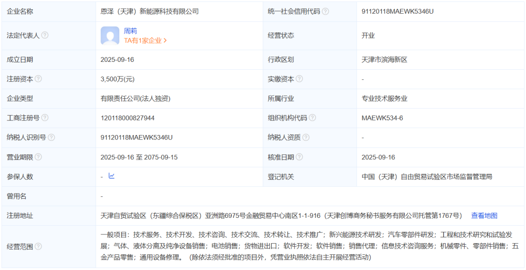 恩泽(天津)新能源科技有限公司成立于2025年09月16日,注册资本3500万元,法定代表人为周莉。经营范围包括一般项目:技术服务、技术开发、技术咨询、技术交流、技术转让、技术推广;新兴能源技术研发;汽车零部件研发;工程和技术研究和试验发展;气体、液体分离及纯净设备销售;电池销售等。
