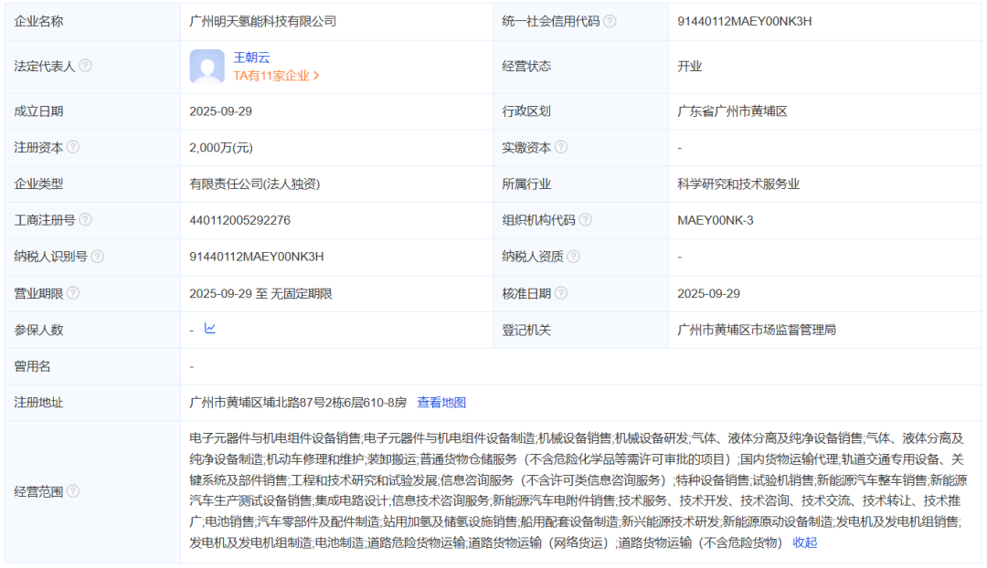 广州明天氢能科技有限公司成立于2025年09月29日,注册资本2000万元,注册地位于广州市黄埔区埔北路87号2栋6层610-8房,法定代表人为王朝云。经营范围包括新能源汽车整车销售;新能源汽车生产测试设备销售;集成电路设计;信息技术咨询服务;新能源汽车电附件销售;电池销售;汽车零部件及配件制造;站用加氢及储氢设施销售;船用配套设备制造;新兴能源技术研发;新能源原动设备制造;发电机及发电机组销售等。