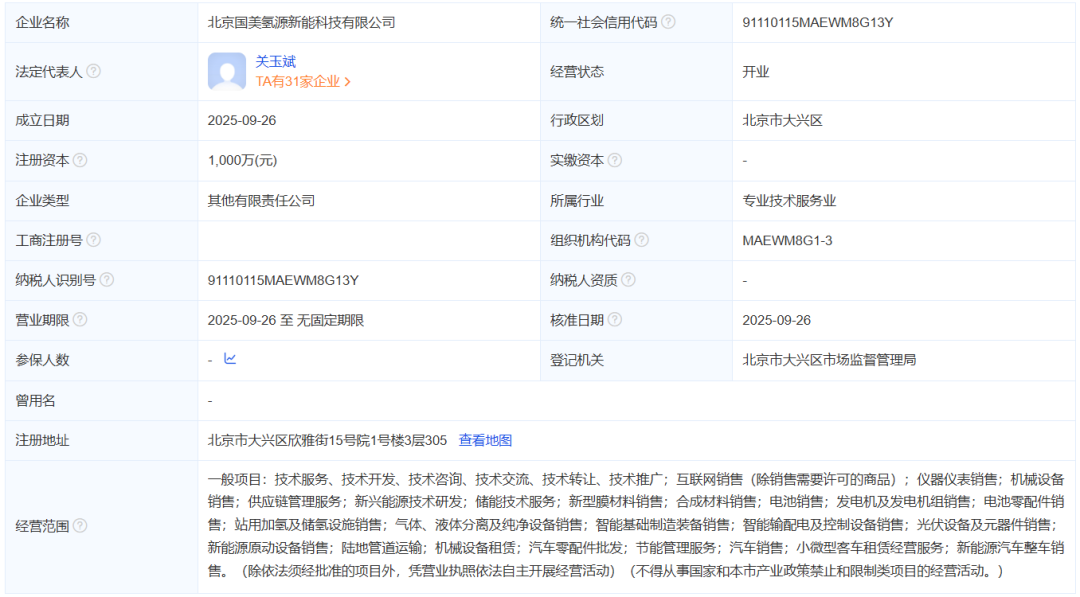 2025年9月10日,北京国美氢能科技有限公司成立。注册资本1000万元,该公司注册地位于北京市朝阳区霄云路26号11层(10)3- 1101-1,法定代表人为关玉斌。经营范围包括一般项目:新兴能源技术研发;储能技术服务;新型膜材料销售;电池销售;发电机及发电机组销售;站用加氢及储氢设施销售;气体、液体分离及纯净设备销售;光伏设备及元器件销售;新能源原动设备销售;陆地管道运输;汽车零配件批发;节能管理服务;新能源汽车整车销售。