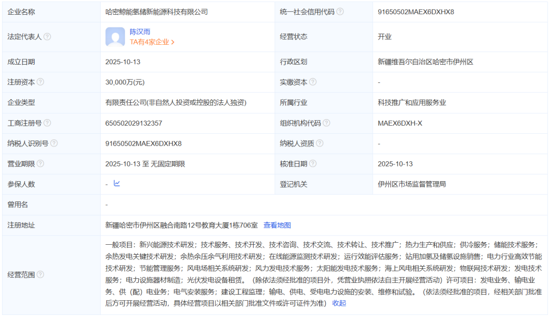 哈密鲸能氢储新能源科技有限公司成立于2025年10月13日,注册资本30000万元,注册地位于新疆哈密市伊州区融合南路12号教育大厦1栋706室,法定代表人为陈汉雨。经营范围包括一般项目:新兴能源技术研发;储能技术服务;站用加氢及储氢设施销售;电力行业高效节能技术研发;风电场相关系统研发;风力发电技术服务;太阳能发电技术服务;海上风电相关系统研发;物联网技术研发;发电技术服务;电力设施器材制造;光伏发电设备租赁等。