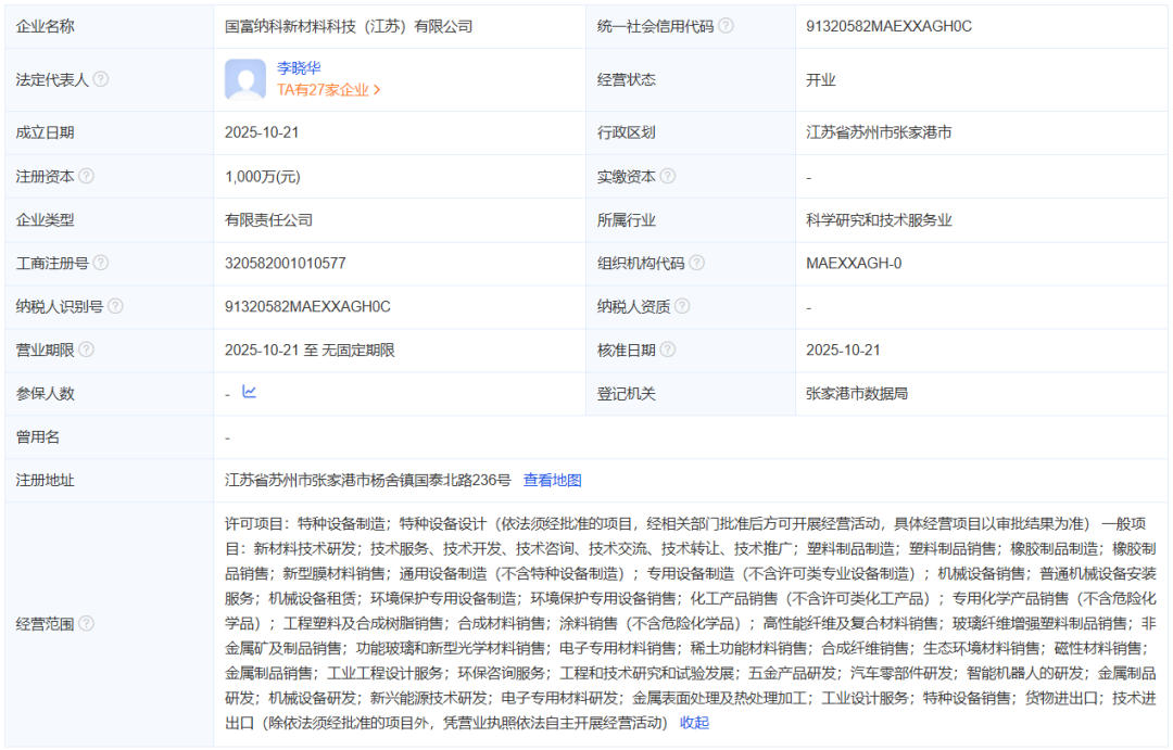 国富纳科新材料科技(江苏)有限公司成立于2025年10月21日,注册资本:1000万元,注册地位于江苏省苏州市张家港市杨舍镇国泰北路236号,法定代表人为李晓华。经营范围包括许可项目:环境保护专用设备制造;环境保护专用设备销售;生态环境材料销售;工业工程设计服务;工程和技术研究和试验发展;汽车零部件研发;机械设备研发;新兴能源技术研发等。