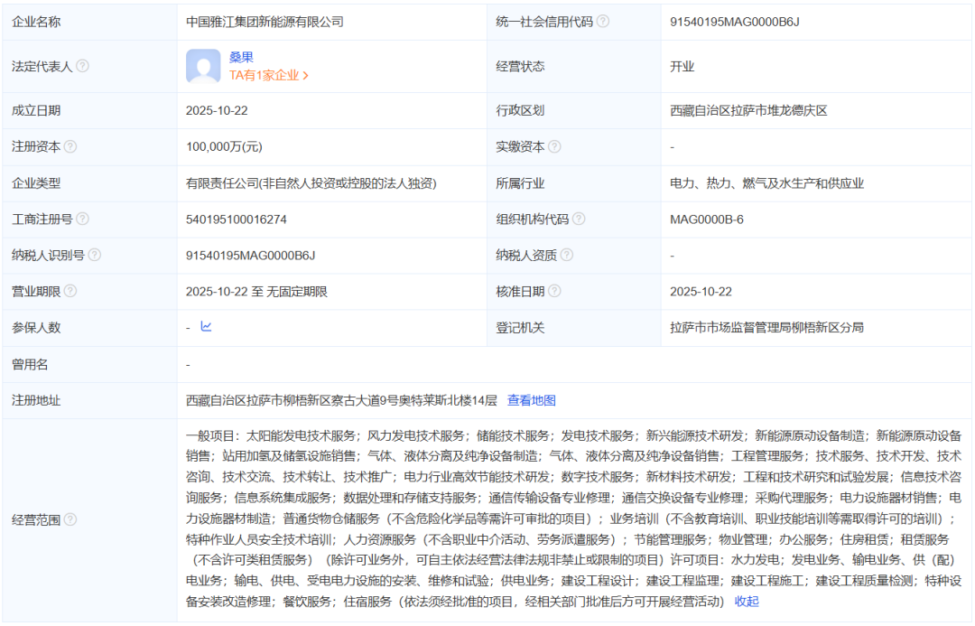中国雅江集团新能源有限公司成立于2025年10月22日,注册资本:100000万元,注册地位于西藏自治区拉萨市柳梧新区察古大道9号奥特莱斯北楼14层,法定代表人为桑果。经营范围包括一般项目:太阳能发电技术服务;风力发电技术服务;储能技术服务;发电技术服务;新兴能源技术研发;新能源原动设备制造;新能源原动设备销售;站用加氢及储氢设施销售;气体、液体分离及纯净设备制造;气体、液体分离及纯净设备销售;电力行业高效节能技术研发等。