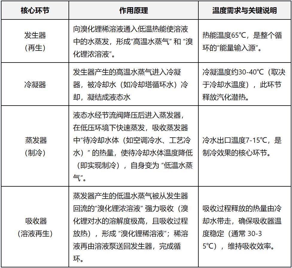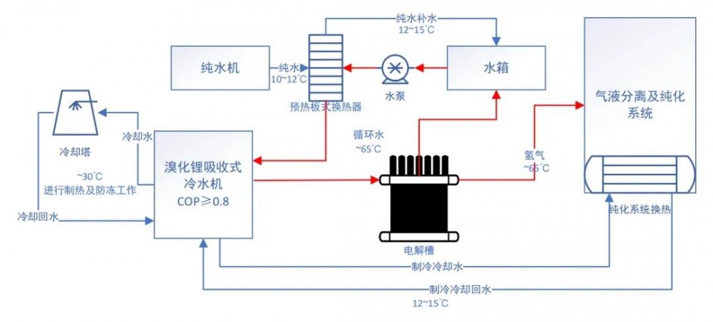 对于电解槽产生的65℃热水,我们将选用溴化锂吸收式制冷机,本质是通过热能驱动,利用溴化锂溶液对水的强吸收特性,完成“水的蒸发-冷凝-吸收-再生”循环,最终实现水的制冷。该制冷机利用电解电堆的稳定低温余热,将其转化为冷能,不但能充当传统压缩式制冷机,将电解槽多余的热能进行吸收,还能利用冷能制取冷却水,提供给氢气纯化、氢气脱氧、厂区空调等其余需要制冷的设备,符合“能量梯级利用”原则,提升整体能源系统效率,实现“制氢+废热制冷+供暖”的多联产,进一步降低单位氢产量的综合能耗。