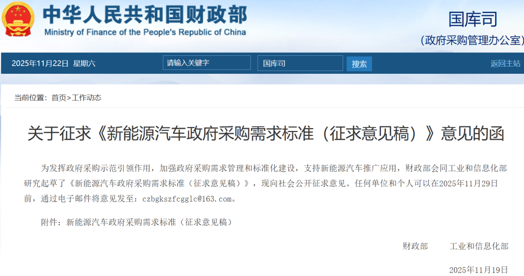 为发挥政府采购示范引领作用,加强政府采购需求管理和标准化建设,支持新能源汽车推广应用,财政部会同工业和信息化部研究起草了《新能源汽车政府采购需求标准(征求意见稿)》,现向社会公开征求意见。任何单位和个人可以在2025年11月29日前,通过电子邮件将意见发至:czbgkszfcgglc@163.com。