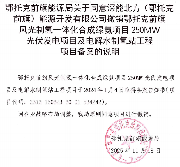 能源圈获悉,近日,鄂托克前旗能源局关于同意深能北方(鄂托克前旗)能源开发有限公司撤销鄂托克前旗风光制氢一体化合成绿氨项目250MW光伏发电项目及电解水制氢站工程项目备案的说明。